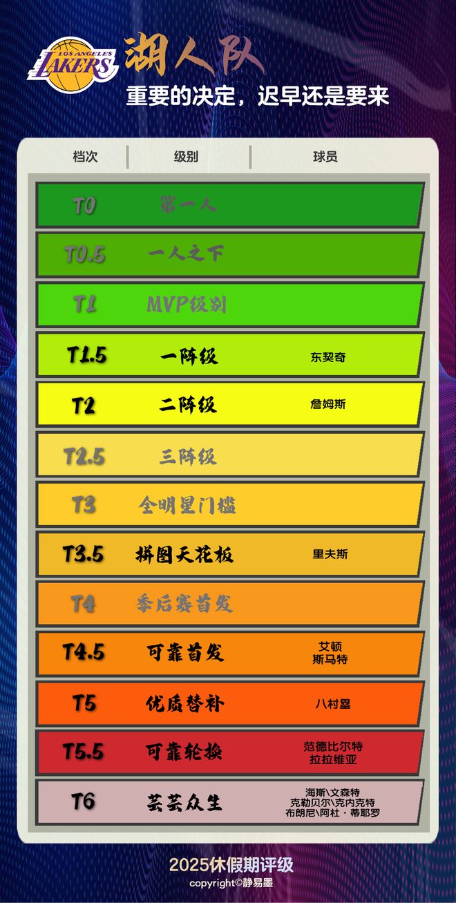 东契奇+“?”。这个版本暗示了,会有一个高水准的第二球星在未来等着湖人。如我们前文所说,你不知道谁会出走,什么样的方案在酝酿,但它可能以意想不到的方式发生。如果是这个路线,25-26赛季就没必要搞大动静。