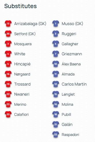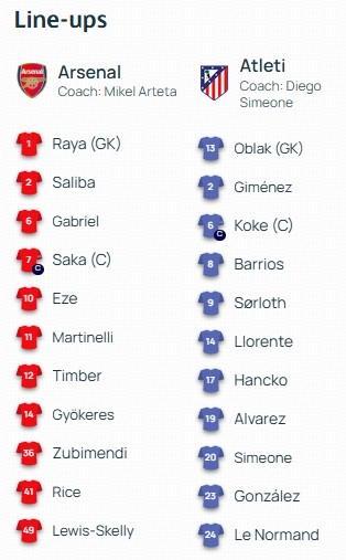 阿森纳首发:1-戴维-拉亚、2-萨利巴、6-加布里埃尔、7-萨卡、10-埃泽、11-马丁内利、12-廷贝尔、14-哲凯赖什、36-苏比门迪、41-赖斯、49-刘易斯-斯凯利